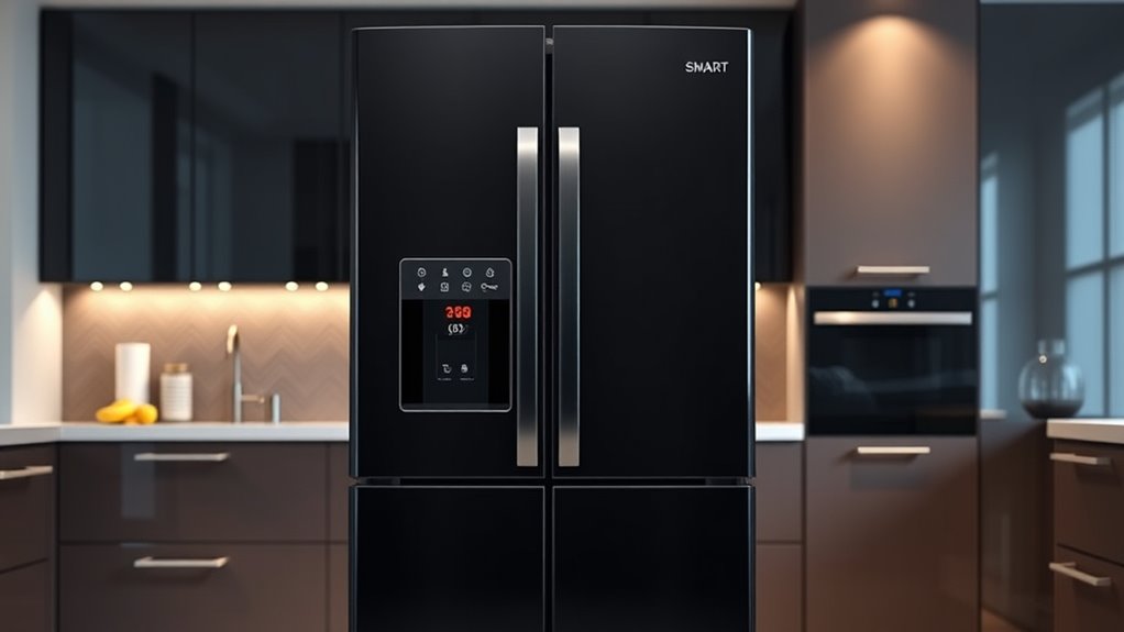 Connectivity options play an essential role in how seamlessly your smart refrigerator integrates with your digital life. Many models feature Wi-Fi, allowing you to control and monitor your fridge remotely through dedicated apps—perfect for busy mornings or meal planning. Bluetooth pairing is also common, enabling quick local syncing with smartphones or tablets. For a more integrated smart home experience, some refrigerators support Zigbee or Z-Wave protocols, connecting to broader automation systems. Voice assistants like Amazon Alexa or Google Assistant are often compatible, offering hands-free control for tasks like adjusting temperatures or checking what’s inside. These connectivity options not only make your fridge more convenient but also enable it to work in harmony with other smart devices, creating a cohesive, automated kitchen environment that simplifies daily routines.