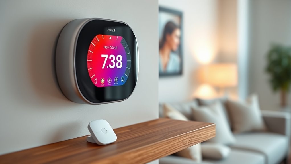 Energy-saving features are the main reason I consider smart thermostats with remote sensors, as they can substantially cut heating and cooling costs. These devices detect occupancy and adjust temperatures accordingly, often saving up to 26% annually. Features like auto-scheduling and adaptive temperature adjustments optimize system operation based on real-time data, ensuring the home stays comfortable without wasting energy. The ability to set specific temperature zones in different rooms allows for targeted comfort and prevents unnecessary heating or cooling. Additionally, integration with utility demand response programs rewards energy-efficient behaviors, further reducing costs. Remote sensors provide more accurate readings across multiple zones, minimizing hot or cold spots and maintaining consistent, efficient climate control throughout the home. These features make smart thermostats a smart investment for energy savings.