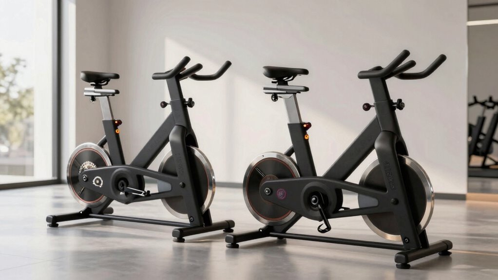 Choosing the right smart trainer bundle means guaranteeing it’s compatible with your bike’s specific type and setup. First, check that the bundle includes compatible axle adapters and quick-release skewers for your bike’s axle standards. It’s also essential to confirm the trainer supports your bike’s wheel size and drivetrain configuration, such as 11-speed or 12-speed. Consider your bike type—road, mountain, or gravel—to ensure proper frame and tire clearance. Additionally, verify the resistance mechanism—magnetic, fluid, or direct drive—matches your training goals and bike specifications. Finally, guarantee the trainer is compatible with your bike’s brake system, whether rim or disc, for a secure fit and safe operation. Proper compatibility guarantees a smooth, effective indoor riding experience.