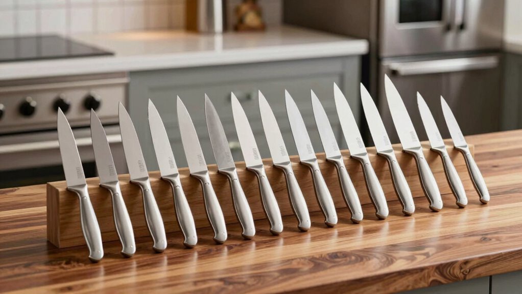 Ever wondered how price and warranty influence your choice of stainless steel knife sets? Higher-priced sets usually feature premium materials, expert craftsmanship, and longer warranties, offering better long-term value. Warranties can range from one year to a lifetime, giving you peace of mind and protection against defects. Many sets with extended or lifetime guarantees provide free repairs or replacements, saving you money over time. On the other hand, budget-friendly options often come with limited warranties, which could lead to additional costs if repairs or replacements are needed. Before making a purchase, it’s crucial to verify warranty details—what damages are covered and whether professional maintenance is necessary. Balancing price and warranty ensures you choose a set that meets both your budget and durability expectations.