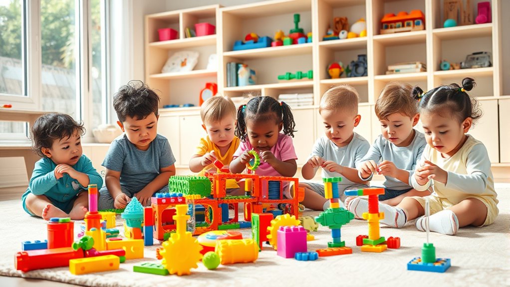 Ensuring safety features are in place is vital when selecting STEM toys for toddlers, as their curiosity often leads to exploring everything within reach. I always look for toys made from non-toxic, BPA-free, and food-grade materials to guarantee they’re safe if touched or mouthed. Rounded edges, sealed magnets, and sturdy construction are essential to prevent injuries or choking hazards. I verify that the toys meet safety standards like ASTM or CPC to confirm they pass child safety regulations. Small parts should be appropriately sized or securely sealed to avoid accidental ingestion. Ultimately, I choose durable, high-quality materials that can handle rough handling without breaking or releasing hazardous substances. Safety isn’t just a feature; it’s the foundation for a positive, worry-free play experience.