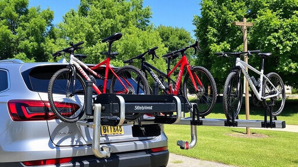 Swing-away hitch racks are surprisingly secure against theft, almost like they’re guarded by a fortress! I’ve found that most models feature lockable arms and hitch pins, making it tough for anyone to steal your bikes or gear. Some even come with built-in locks or options for extra security. Still, I always recommend locking your bikes to the rack and parking in well-lit areas for maximum peace of mind.