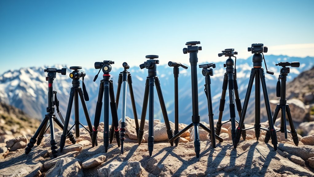 Ensuring stability and balance is essential for capturing sharp, clear photos while on the move, especially since uneven terrain can easily cause camera shake. A sturdy build, often from aluminum or carbon fiber, helps keep the tripod stable on rough surfaces. Proper weight distribution and a low center of gravity prevent wobbling during long shoots or with heavier gear. Features like rubberized or spiked feet improve grip, reducing slips on different terrains. Lockable leg sections and a reliable ball head keep the tripod steady, preventing unwanted movement that could ruin your shot. Additionally, choosing a tripod with a maximum load capacity that matches or exceeds your camera’s weight guarantees it won’t tip or wobble. Stability and balance are the foundation for sharp, professional images on your adventures.
