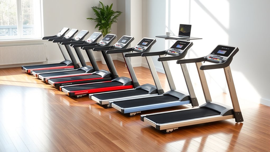 Choosing the right under-desk treadmill means considering portability and storage options to suit your space and lifestyle. I always check the treadmill’s weight and dimensions to guarantee I can easily move and store it. Models with transport wheels or handles make life so much easier when I need to change locations. I also look for foldable designs or compact options that fit snugly under desks or in closets, maximizing my space. Lightweight construction and quick-release mechanisms are features I value for hassle-free repositioning. Finally, I evaluate whether the treadmill’s size and weight match my ability to handle it safely during setup and storage. Balancing these factors helps me stay active without overwhelming my living space.