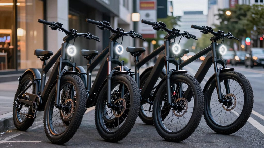 Choosing the right suspension type on an urban e-bike is essential for a smooth, comfortable ride, especially on varied city terrains. There are two main options: rigid forks and full suspension, which includes both front and rear shocks. Air suspension forks are adjustable, allowing you to fine-tune stiffness for different surfaces, and they excel at absorbing bumps. Coil suspension forks, on the other hand, offer a more responsive feel and are typically more durable, but they tend to be heavier. The travel distance of the fork, usually between 30mm and 170mm, also impacts comfort—more travel means better shock absorption on rough surfaces. Plus, guarantee compatibility with your bike’s wheel size, axle, and steerer tube, so the suspension fits perfectly.