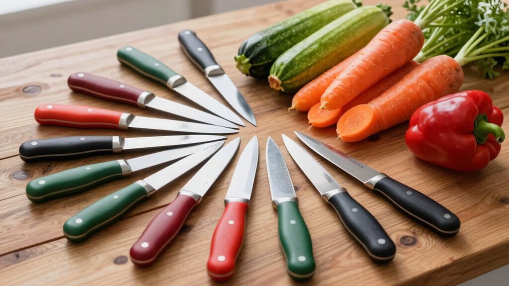 Since comfort and control are essential for efficient vegetable prep, paying attention to handle ergonomics is vital. An ergonomic handle that fits naturally in your hand reduces fatigue during long cutting sessions and enhances comfort. Non-slip grips made from textured or rubberized materials boost control and safety, especially when working with wet or slippery ingredients. Handles with full tang construction offer better balance and stability, preventing wobbling and improving precision. Contoured handles that follow the natural shape of your hand promote a secure grip and lessen wrist strain. Proper handle size and weight distribution are also crucial, making maneuvering easier and more precise. When choosing a vegetable knife, prioritize these ergonomic features to ensure a comfortable, safe, and efficient prep experience.