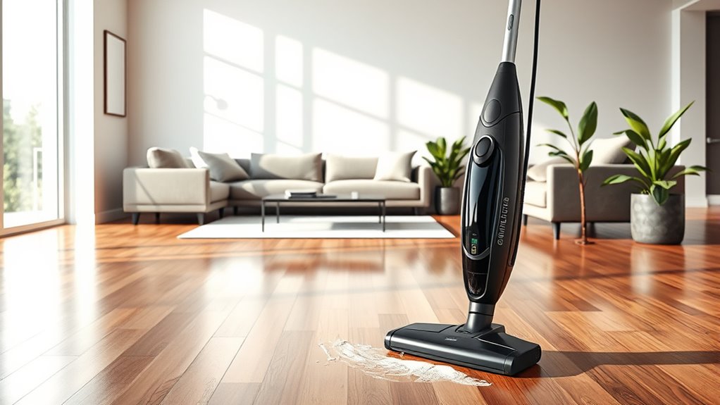 While I appreciate a powerful cleaning tool, the importance of self-cleaning features in wet-dry vacuum mop combos can’t be overstated. These features maintain peak hygiene by automatically rinsing brushes and internal components, which means I spend less time on manual cleaning. Devices with self-cleaning cycles often use hot water or air drying to eliminate odors, mold, and bacteria, ensuring my home stays fresh. Plus, self-cleaning systems extend the lifespan of brushes and prevent debris from clogging the device. I love that automated cleaning functions decrease downtime, allowing for more frequent cleaning. Just remember, the effectiveness can vary; investing in a higher-quality system often means more cleaning modes and thorough drying for complete hygiene.