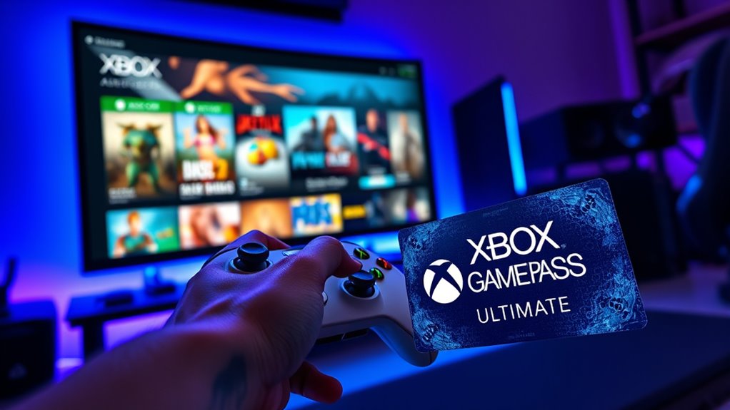 Considering the additional perks that come with Xbox Game Pass Ultimate can considerably enhance your gaming experience and overall value. These perks often include in-game content like character unlocks, cosmetics, and exclusive items for popular titles such as Call of Duty and League of Legends. Subscribers also earn rewards points, which can be redeemed for discounts or gift cards, adding more savings. The membership provides exclusive discounts on select games and add-ons, making it easier to expand your library affordably. Some plans even offer bonus content like hero passes, outfit packs, and weapon skins that customize your gameplay. These extras are designed to keep the experience fresh and rewarding, encouraging ongoing subscription use while maximizing your overall gaming enjoyment.